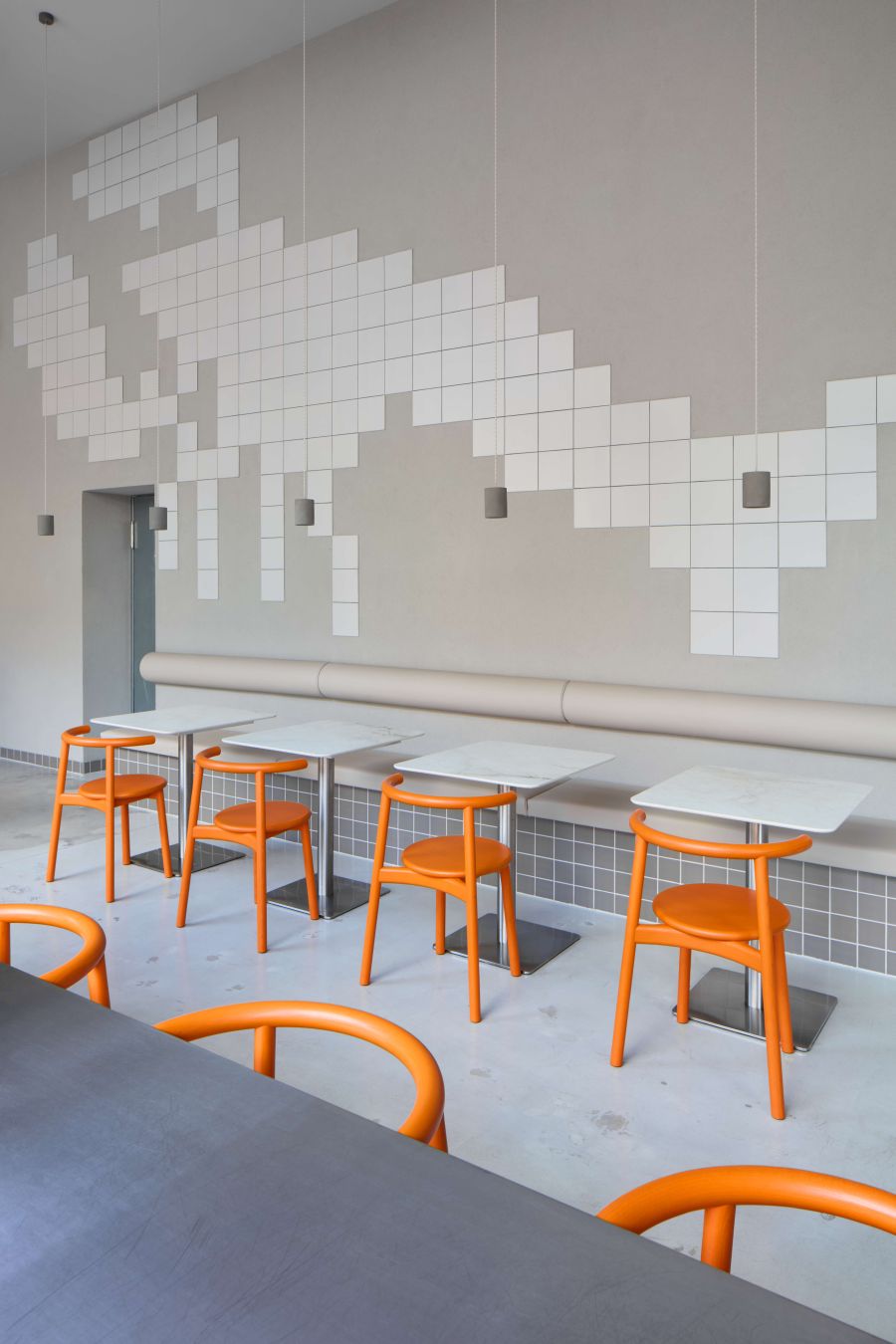 Interiér je postavený na ladění neutrálních tónů a akcentu tmavě oranžové, připomínající barvu raka. Autoři rekonstrukce předvedli dokonalou kreativní práci se základním čtvercovým formátem keramické dlažby, ukázali, jak je možné s ním v prostoru vytvořit až umělecky působící prvek! „Architekti sem vymysleli barevné židle, které nádherně kontrastují s šedým prostorem a vnášejí do něj výraznou energii. Nejgeniálnějším nápadem jsou jednoznačně dvě mozaiky raka a kraba poskládané z keramických dlaždic. Vypadají fantasticky, neruší, zároveň skvěle doplňují velké plochy stěn,“ chválí Patrik Yeranyan a David Neuhäusl vysvětluje: „Nejdřív jsme vybrali vhodné siluety raka a kraba, které jsme na počítači rozpixelovali. K vytvoření nástěnných motivů jsme (už poněkolikáté) použili námi oblíbené dlaždice české značky RAKO. V tomto případě konkrétně sérii Color Two s matným povrchem, pracovali jsme se dvěma formáty dlaždic – 10 x 10 a 20 x 20 centimetrů. Předem jsme připravili i spárořezy. Na svislé plochy, na míru vyrobených dlouhých sedacích lavic a také soklů, jsme použili tmavě šedý odstín čtvercového formátu 10 x 10 centimetrů ze stejné kolekce.“