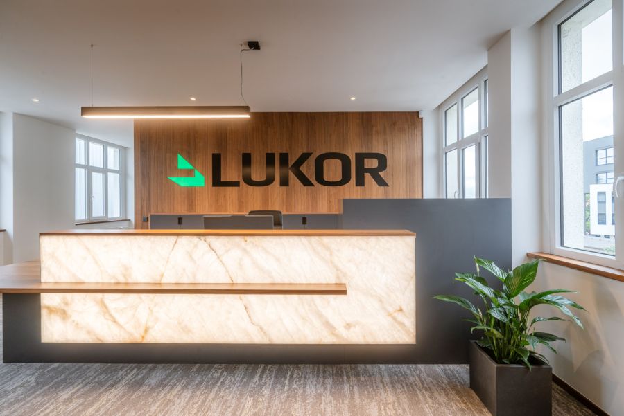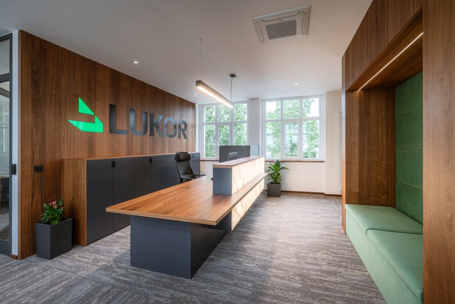 Prostor reprezentuje naši práci – od výběru materiálů přes detaily až po atmosféru. Dominantou je recepční pult s podsvíceným kamenem.