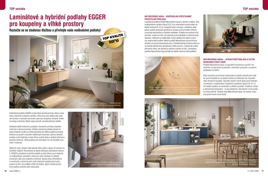 Zákazníci mají v dnešní době obecně velký výběr a nejsou již omezeni na konkrétní materiál. Rozmanitost je stejně velká jako neomezené možnosti. EGGER Laminátové a hybridní podlahy na bázi dřeva jsou k dispozici ve voděodolných variantách, které jsou velmi oblíbené ve vlhkých prostorách, jako jsou koupelny a kuchyně. Spojují krásu dřevodekorů s trvanlivostí a odolností proti vodě moderních podlahových krytin, snadno se čistí, jsou měkké a tišší než dlažba. Jejich montáž je také jednoduchá, a to pomocí click systému.