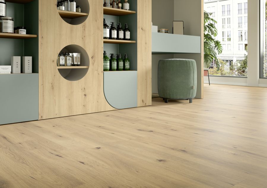 „U dubu Sherman prezentujeme dvě povrchové struktury se synchronizovanými póry, které lze najít ve stejném dekoru jak v kolekci nábytku a interiérového vybavení, tak i v kolekci podlah. To znamená, že byl pro vývoj dekoru použit stejný materiál jako šablona. Výsledkem je „dekorová shoda” mezi nábytkem a podlahou se synchronizovanými povrchy,” vysvětluje Klaus Monhoff, Head of Design & Decor Management.