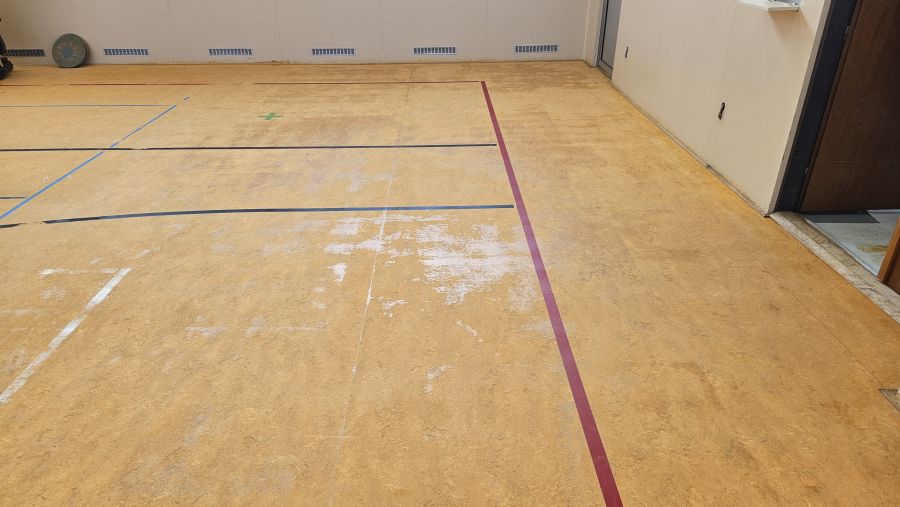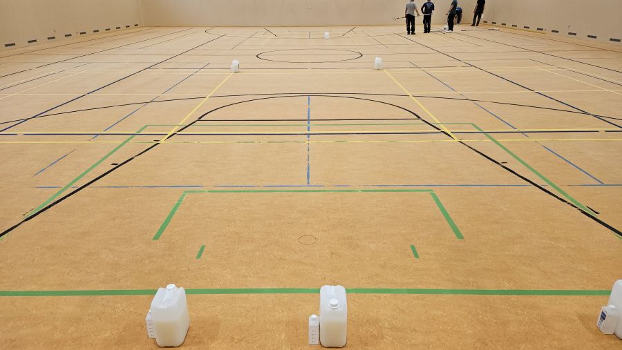 Popis obrázku: Hotovo. Po lakování 2K-PU lakem se sportovní certifikací Dr. Schutz PU Siegel mat je tělocvična připravena na každodenní silný provoz.