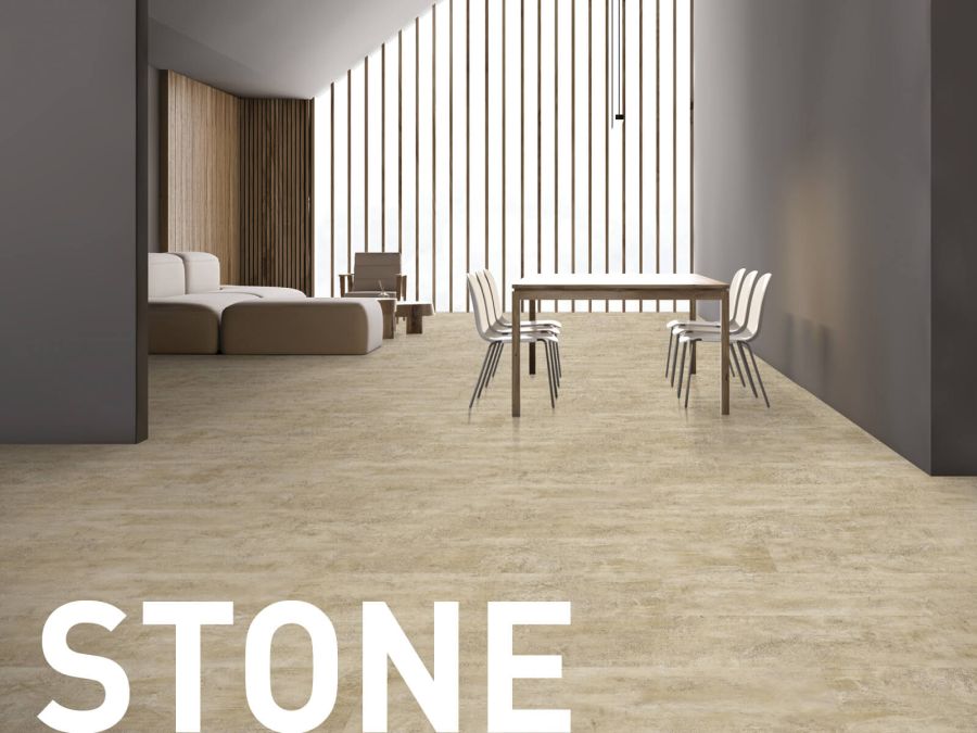 Kolekce Stone zahrnuje 12 dekorů v přírodních a industriálních tónech. Nabízí motivy pískovce, kamene, betonu i kovu, které se uplatní v moderních i technicky laděných interiérech. Dílce o rozměru 900 × 300 mm působí přirozeně při pokládce na menších i větších plochách. Kolekce je vhodná do vstupních hal, kuchyní, obchodních a veřejných prostor, kde je kladen důraz na odolnost a snadnou údržbu.