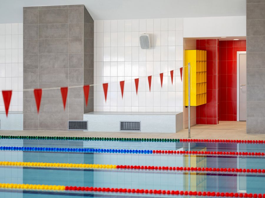 V bazénové hale byly použity keramické obklady sérií Pool a Color Two v decentních odstínech, které podporují dojem čistoty a světlosti. Konstrukční prvky sloupů jsou zvýrazněny obklady imitujícími beton ze série Cemento. Architektonický návrh zahrnoval i interiéry navazujících prostor, včetně zóny občerstvení. „Ve vstupní hale převládají zemité a útulné tóny – tmavší dlažba 60 × 60 a 30 × 60 cm Quarzit doplněná nábytkem v dekoru dubu. Barvu šatních skříněk volil investor. Výsledná podoba projektu je také zásluhou vedení stavby, které sehrálo klíčovou roli v realizaci,“ uzavírá architekt Kadečka.