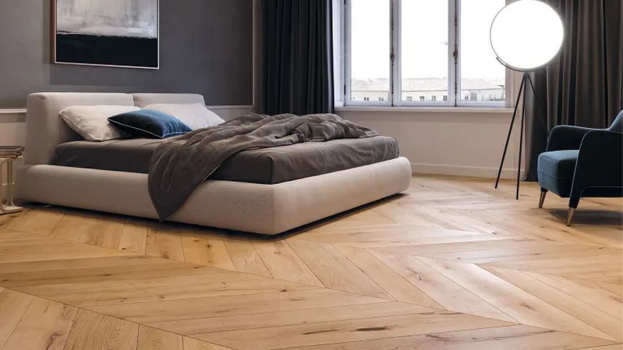 Dřevěné podlahy Chevron 45° od Labor Legno navazují na oblíbený historický vzor, který do interiéru přináší noblesu a rytmus. Variabilita šířek a délek jednotlivých parketek umožňuje přizpůsobit skladbu konkrétnímu prostoru a podtrhnout jeho architektonický výraz.