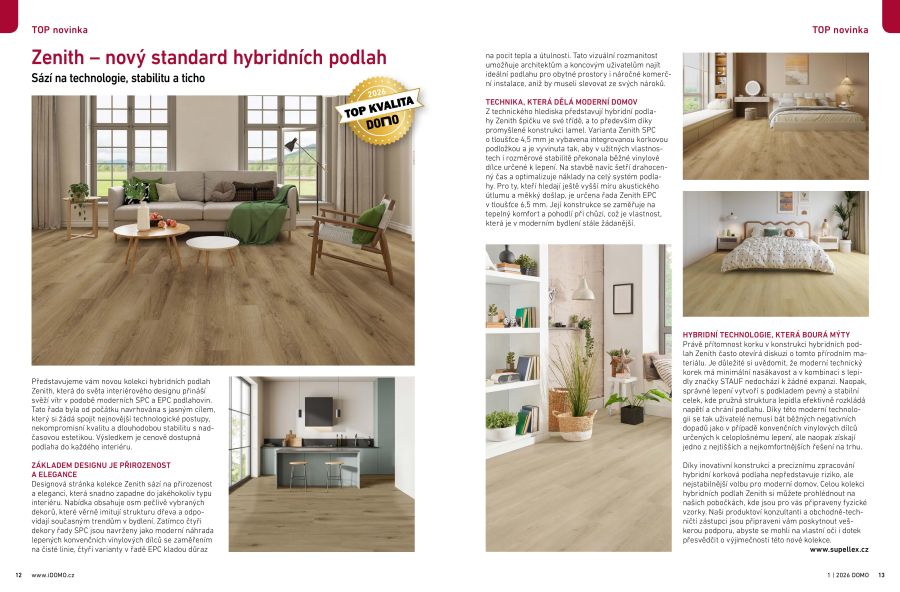 Z technického hlediska představují hybridní podlahy Zenith špičku ve své třídě, a to především díky promyšlené konstrukci lamel. Varianta Zenith SPC o tloušťce 4,5 mm je vybavena integrovanou korkovou podložkou a je vyvinuta tak, aby v užitných vlastnostech i rozměrové stabilitě překonala běžné vinylové dílce určené k lepení. Na stavbě navíc šetří drahocenný čas a optimalizuje náklady na celý systém podlahy. Pro ty, kteří hledají ještě vyšší míru akustického útlumu a měkký došlap, je určena řada Zenith EPC v tloušťce 6,5 mm. Její konstrukce se zaměřuje na tepelný komfort a pohodlí při chůzi, což je vlastnost, která je v moderním bydlení stále žádanější.