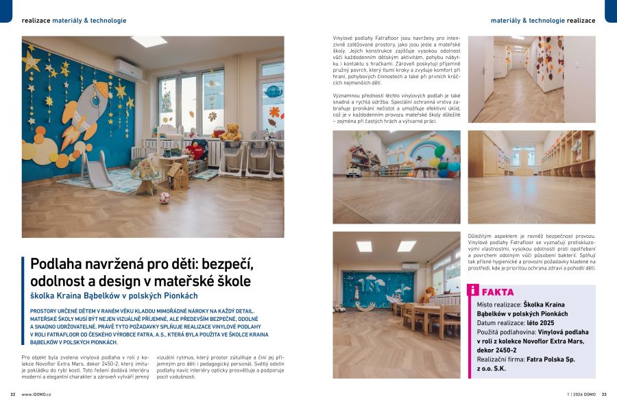 Mateřské školy musí být nejen vizuálně příjemné, ale především bezpečné, odolné a snadno udržovatelné. Právě tyto požadavky splňuje realizace vinylové podlahy v roli Fatrafloor od českého výrobce Fatra, a.s., která byla použita ve školce Kraina Bąbelków v polských Pionkách.