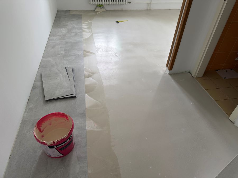 - Použité materiály: Ceresit R 766 - univerzální penetrační nátěr, Ceresit DC - anhydritová samonivelační podlahová hmota, Ceresit K 188 E - speciální disperzní lepidlo