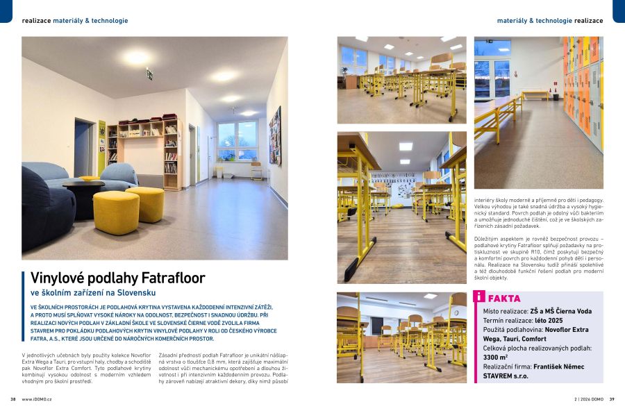 Ve školních prostorách je podlahová krytina vystavena každodenní intenzivní zátěži, a proto musí splňovat vysoké nároky na odolnost, bezpečnost i snadnou údržbu. Při realizaci nových podlah v Základní škole ve slovenské Čierne Vodě zvolila firma STAVREM pro pokládku podlahových krytin vinylové podlahy v roli od českého výrobce Fatra, a.s., které jsou určené do náročných komerčních prostor.