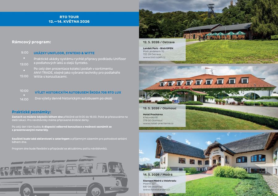 Společnost ANVI TRADE s. r. o. Vás zve na RTO TOUR 2026, sérii setkání pro odbornou veřejnost z oblasti podlahových krytin.