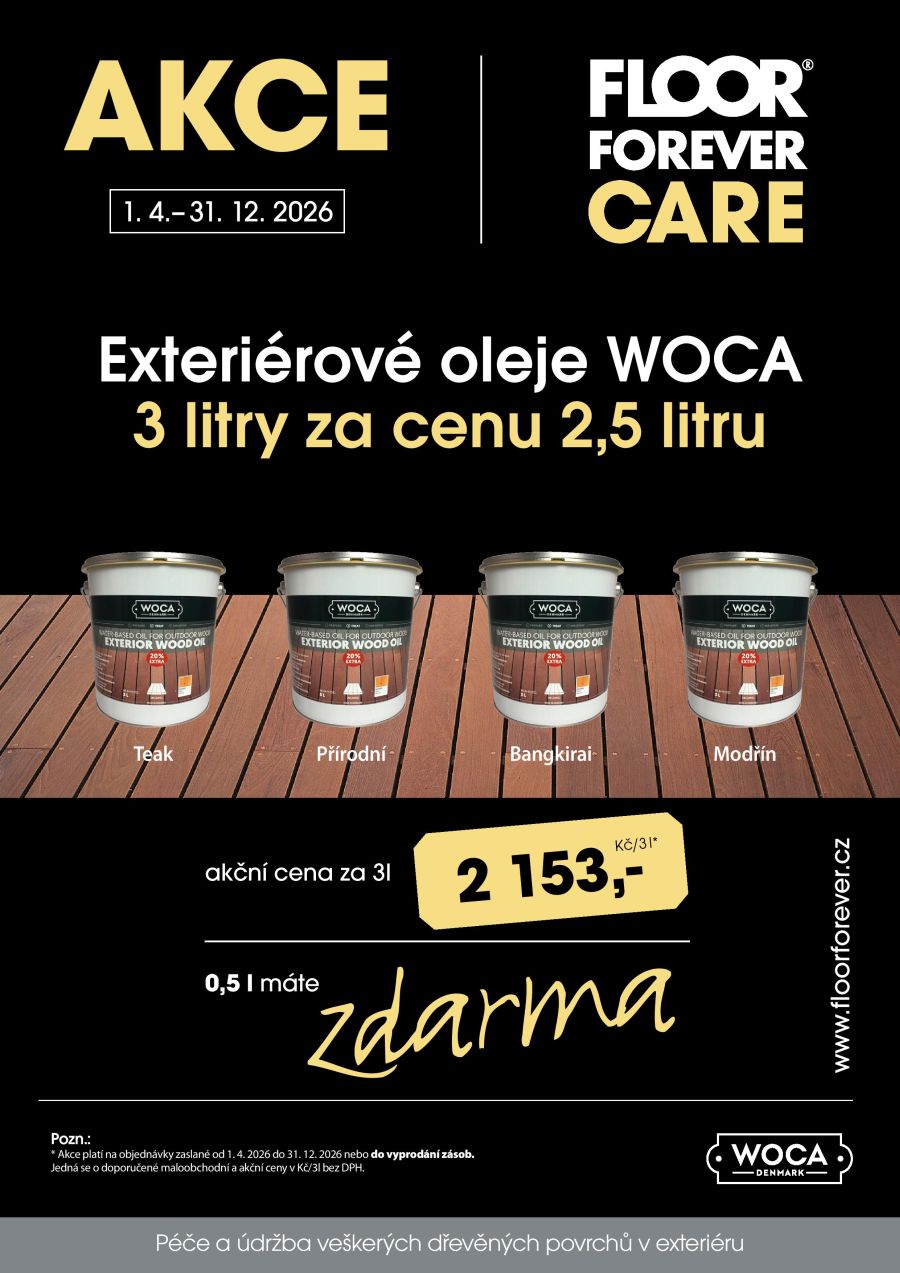 V nabídce značky FLOOR FOREVER CARE najdete širokou škálu barevných odstínů exteriérových olejů WOCA. Odstíny Přírodní, Teak, Bangkirai a odstín Modřín v současné době zakoupíte za akční maloobchodní cenu 2 153 Kč/3 l bez DPH. Akce platí od 1. 4. 2026 do konce roku 2026 nebo do vyprodání zásob.