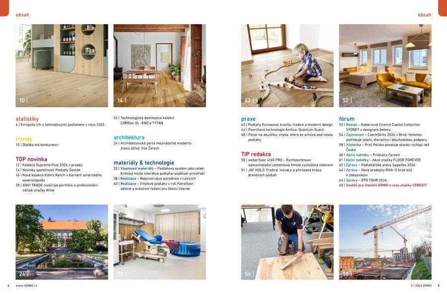 Závěrečná část čísla patří samotnému oboru. CzechSkills 2026: řemeslo v přímém přenosu na brněnském výstavišti (strana 54) připomíná význam odborných dovedností a nastupující generace řemeslníků. A jako každý rok jsme se zúčastnili podlahářských arén společnosti Supellex, ze kterých přinášíme krátké shrnutí na straně 62.